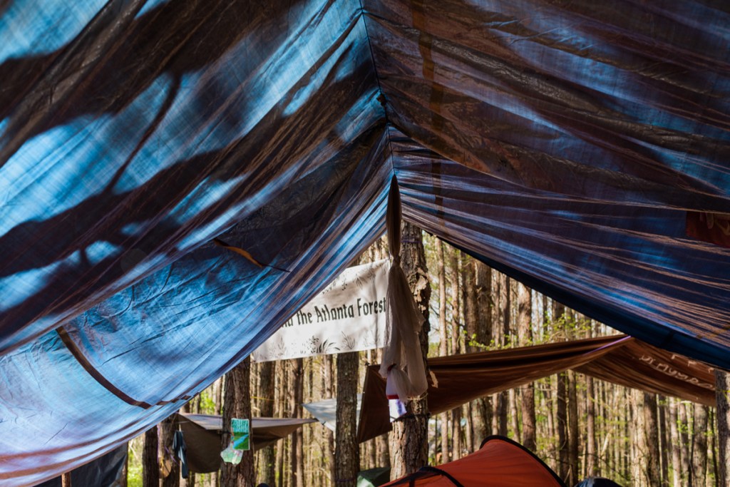 A scene from the Living Room, a gathering space in the Weelaunee Forest “where community comes together to share food, play music, dance, exchange ideas, camp, meet new people, and enjoy being with nature and friends,” says organizer Johnna Gadomski. Located in a grove of pine trees, the area stays cool and shaded even in the hot Atlanta summers — a perfect example of how intact forest lowers temperatures in the surrounding area. Families visiting the forest defenders sometimes stopped by for a snack, and the children would run around and play. Though the Living Room is now off-limits like the rest of the forest, Gadomski remembers it as “a place of laughter, hope, inspiration, collaboration, togetherness, and love” where she hopes to be able to gather again soon. It has been destroyed by police before, and it can be built by the people again.